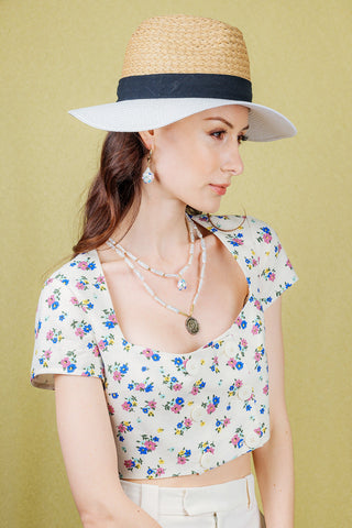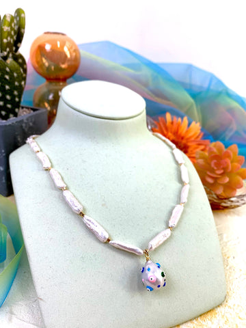 This handmade necklace is made of freshwater pearls with painted evil freshwater pearl pendant and Japan golden plated brass findings. It's simple but pretty which can be worn from day to night for any occasion. Matching with Farra earrings and straw hat to complete your look! Also, this is a very lovely gift for birthday, anniversaries or festivals.